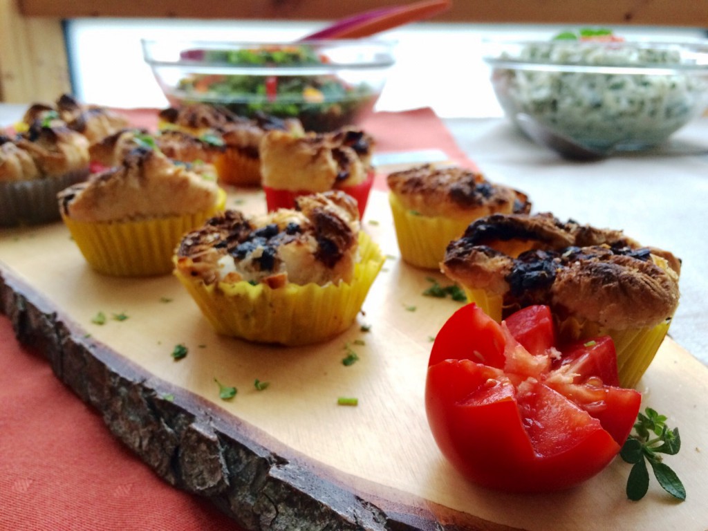 überbackene Champignons mit Wildkräuterhackfleisch gefüllt